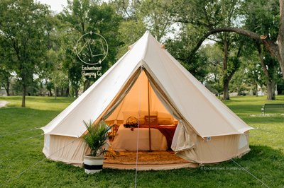 Experience luxury camping with our Glamping tents. Your package includes a fully set up 16-foot diameter white canvas Bell Tent equipped with a deluxe rug, comfortable elevated queen-size bed(s) complete with all necessary linens, comforters, pillows, side tables, chairs, and ample lighting. Electricity is available for low-power devices, and a nearby restroom. Upon check-in, a credit card is required for a $200 damage deposit. Rentals only. Entry tickets are purchased separately.
